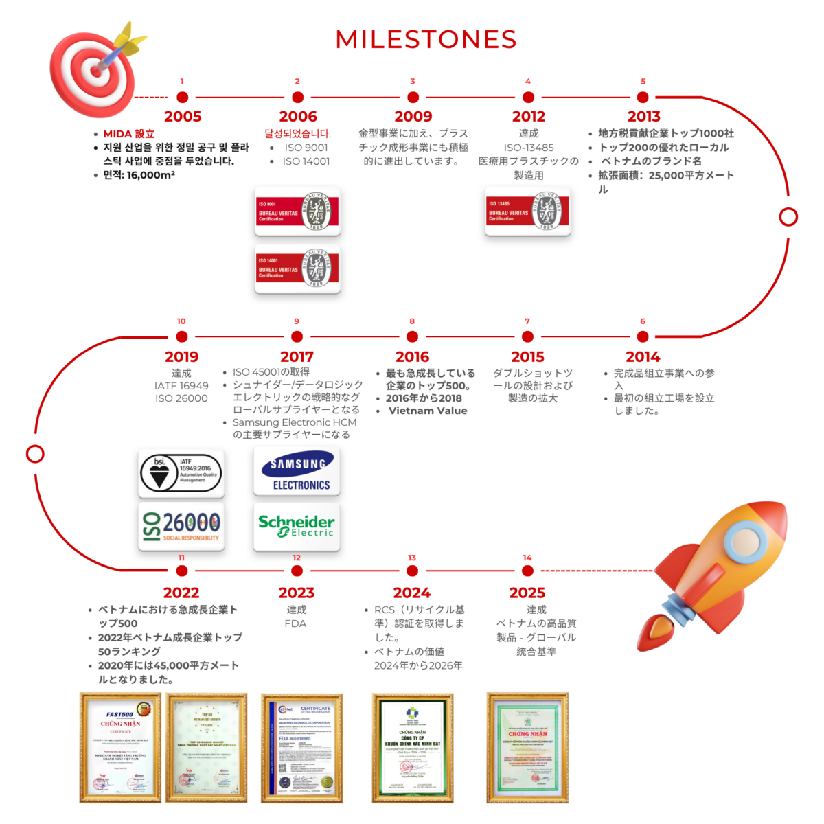 MIDA – 精密プラスチックおよび金型製造業界でアジアのトップメーカーになることを目標に、常にお客様のあらゆるニーズに寄り添い、最善のサービスを提供する信頼できるプロフェッショナルパートナーです。
